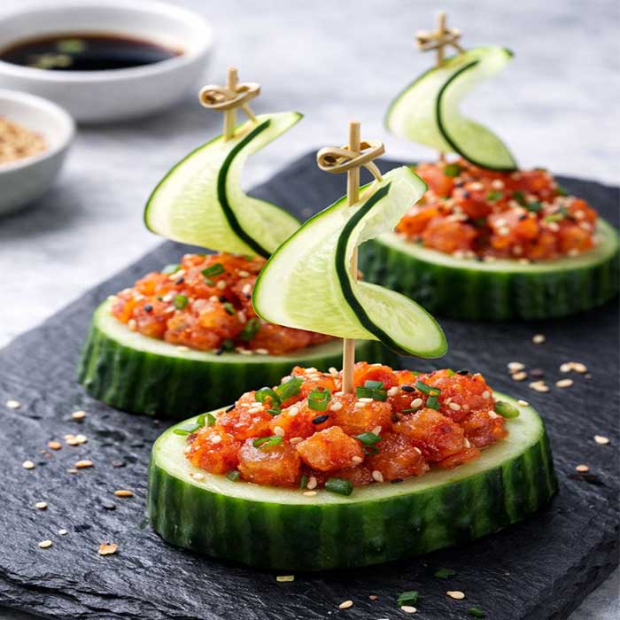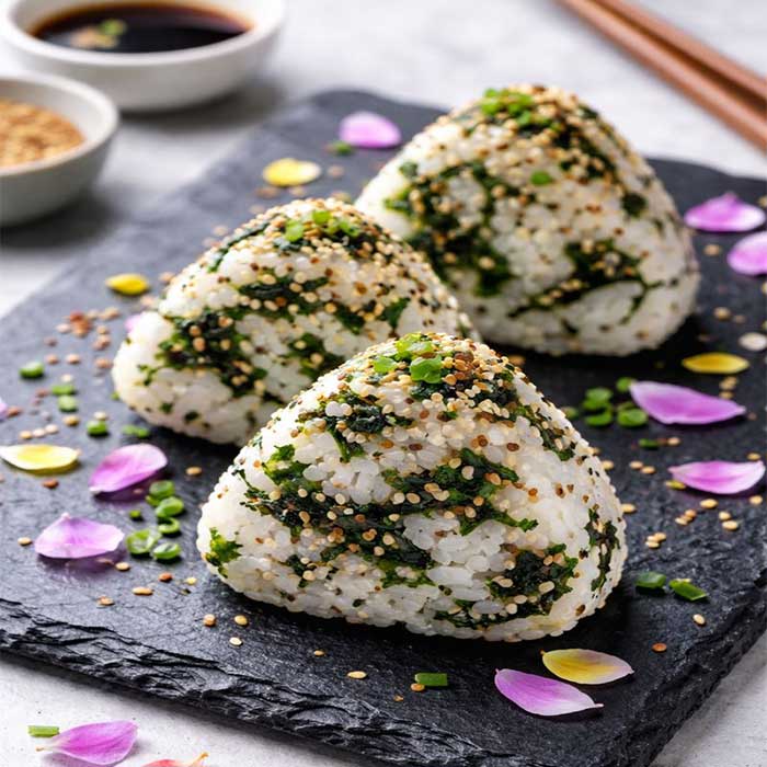 2๏ธโฃ Sesame toasted Wakame Onigiri,ย Spicy tuna cucumber boat